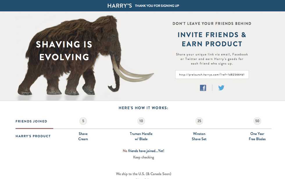 Contoh : Harry’s, sebuah toko online yang menjual alat cukur, menggunakan pendekatan ini dan meraih kesuksesan. Mereka menawarkan produk gratis dengan sharing website mereka sebelum hari peluncuran. Dengan menggunakan taktik ini, Harry’s mendapatkan 100.000 subscriber bahkan sebelum meluncurkan toko online-nya.