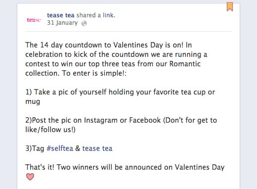 Penting untuk diingat bahwa anda tidak harus memulai dari sesuatu yang besar. Tease Teaadalah toko online teh yang menjalankan kontes sederhana pada halaman Facebook mereka.