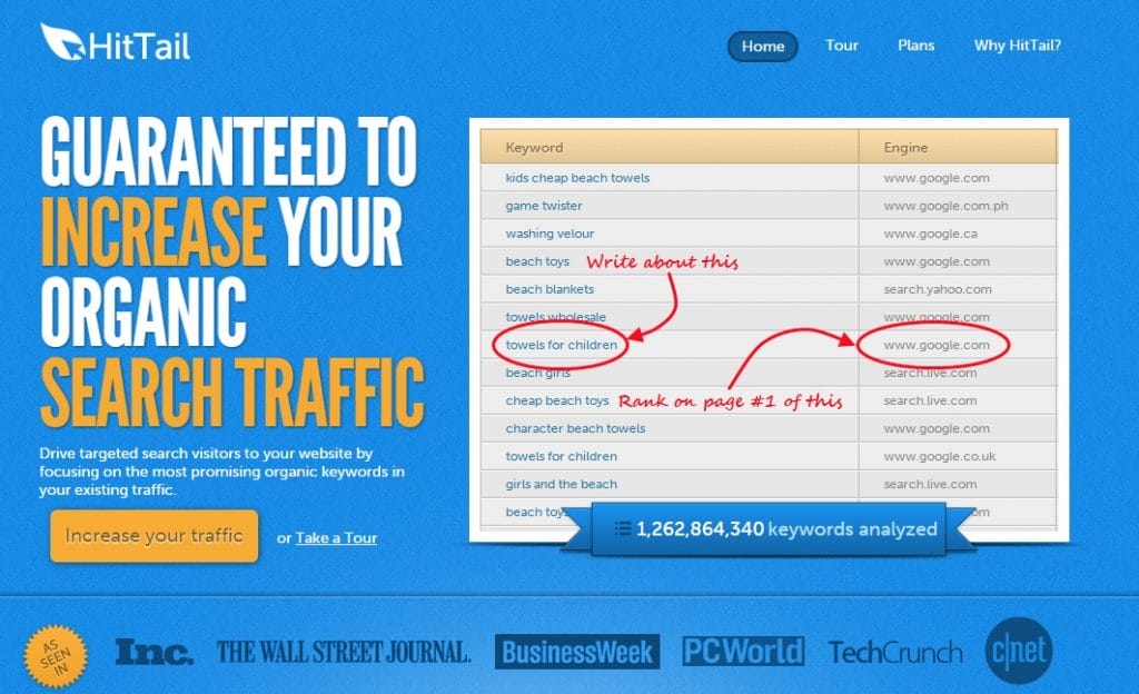 Hittail.com dapat memberikan Anda rekomendasi longtail keyword untuk Anda, berdasarkan konten website Anda dan search volume dari keyword yang cocok dengan konten Anda.